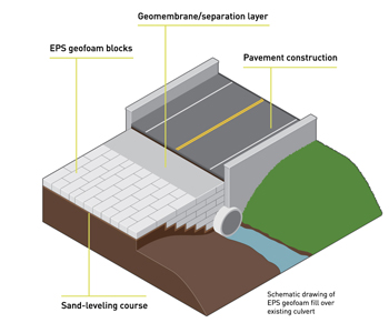 There are numerous manufacturers and suppliers of EPS geofoam in North America. Expanded polystyrene is created in a two-stage, molded bead process. EPS geofoam is produced in blocks that can be cut into various shapes and sizes – and a range of compressive resistances – to suit specific project needs. As an engineered product, it can be produced to obtain the required compressive resistance. EPS geofoam density, only about 1% that of soil and rock, is controlled during the manufacturing process, making it a superior, ultra-lightweight fill material that significantly reduces the stress on underlying subgrades. The lighter load can reduce settlements and can improve stability against bearing and slope failures.